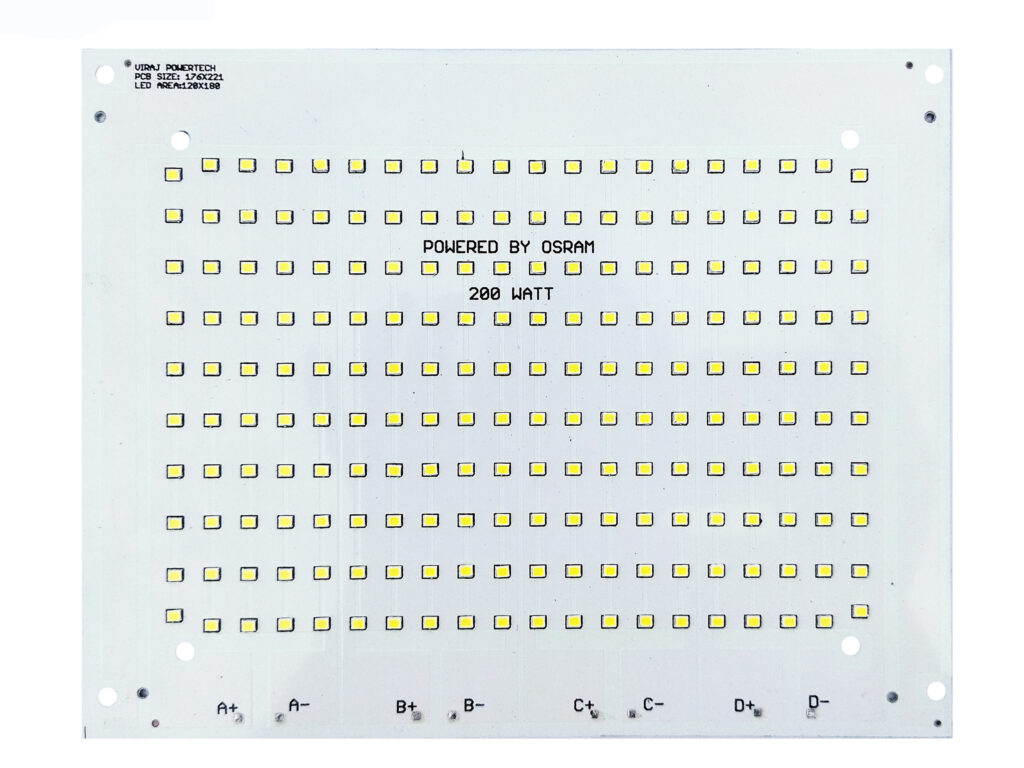 - High Lumen LED : This PCB contains 200 LED chip with 120 to 140 Lumen per watts/led